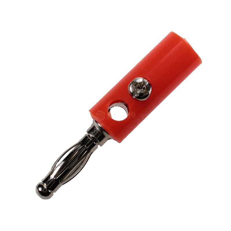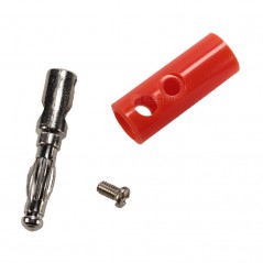 Conector banana hembra de 4mm en color ROJO con tuercas para sujetar cables.