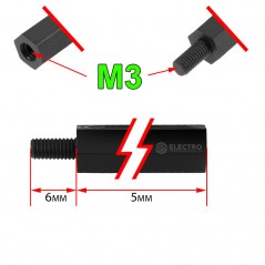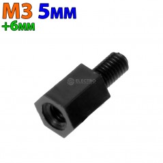 Separador o extensor de Nylon en color Negro de M3 x 5mm + 6mm de forma hexagonal.