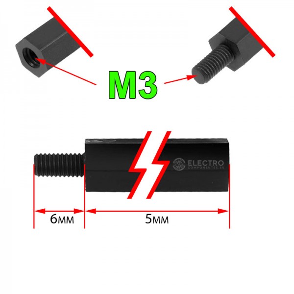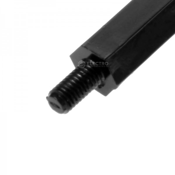 Separador o extensor de Nylon en color Negro de M3 x 5mm + 6mm de forma hexagonal. En un extremo dispone de rosca externa M3 de 6mm y en el otro dispone de roca interna M3, por lo que es posible unir varios extensores para obtener un de mucha más longitud. Ideal para usar como separador o aislador en todo tipo de placas electrónicas gracias a las propiedades aislantes que tiene en Nylon.