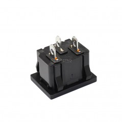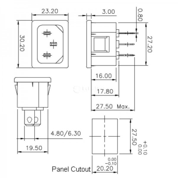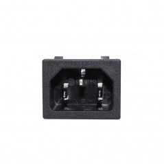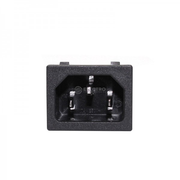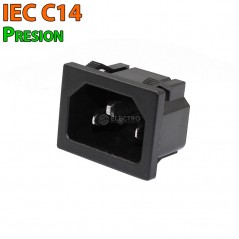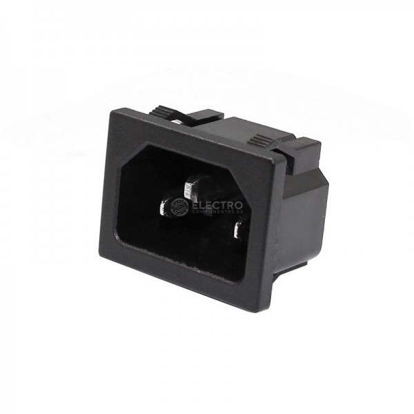Conector IEC C14 Macho para colocar el panel con fijación por presión, soporta intensidades de 10A y voltajes de 250v. Conector IEC (International Electrotechnical Commission) es el nombre común que recibe el conjunto de trece conectores de alimentación eléctrica definidos en la especificación IEC 60320 (anteriormente IEC 320) de la Comisión Electrotécnica Internacional (IEC). Es un conector polarizado con tres conexiones rectangulares de 2,7x5,5mm, con base del conector rectangular con unas medidas de 22,78x15,6mm y dos biseles en la parte superior formando un ángulo de 90º, soporta una intensidad máxima de 10A y un voltaje de 230v. Ampliamente usado para la alimentación de equipos informáticos como fuentes de alimentación de ordenadores, monitores, impresoras y otros periféricos.