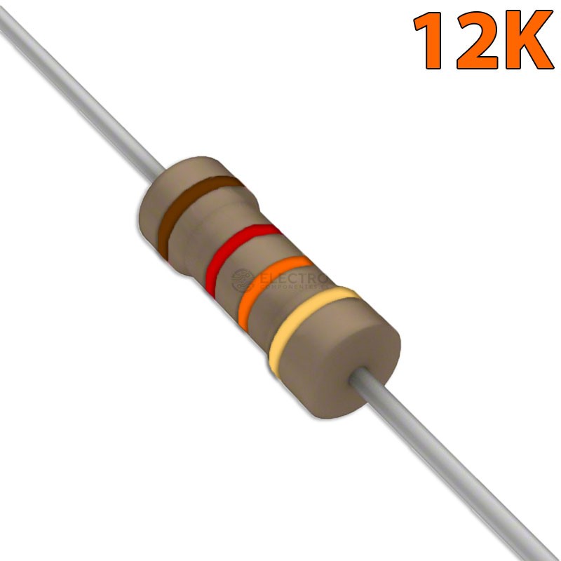 Esta resistencia es de 12K ohm y 0,25w de potencia con una tolerancia del ±5%, resiste un voltaje máximo de 300V, gracias a su forma pueden ser fácilmente incorporadas tanto a un protoboard como a una placa perforada o ser soldada directamente.