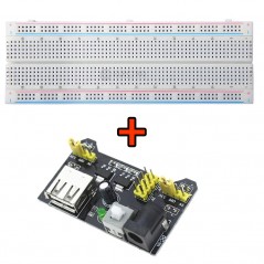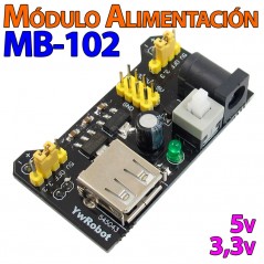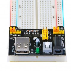 Este módulo es la forma más sencilla de alimentar protoboard MB-102 (830 y 400 puntos), unas de las protoboard más populares que existe para pequeños proyectos de electrónica, robótica y automatización. Cuenta con una pequeña protección contra cortocircuito, además tiene un LED indicador de alimentación, por lo que si hay un corto el LED se apaga avisándonos del corto. Tiene dos modos de entrada de alimentación, a través de un puerto USB o a través de un conector Jack DC de 5,5 x 2,1mm, el cual puede ser alimentado desde 6,5v DC a 12v DC, también incorpora un interruptor para controlar el suministro de energía.
