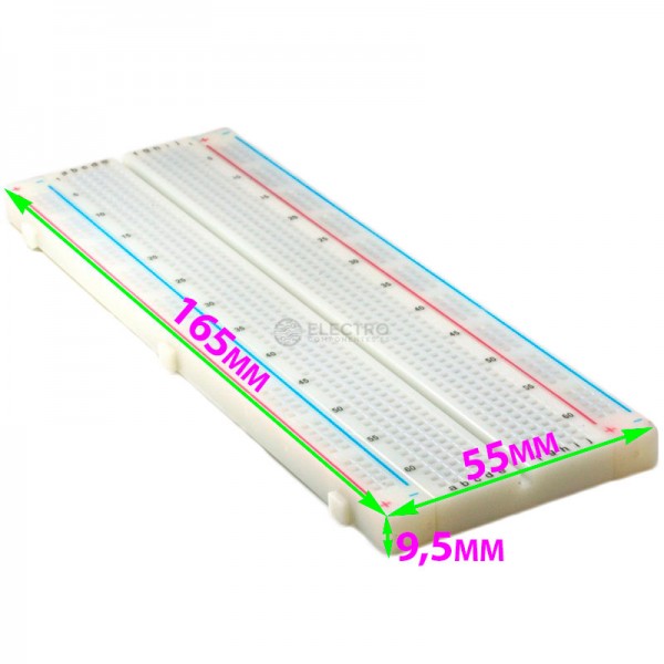 Protoboard de color blanco con 830 puntos de contacto. De uso diario para los estudiantes de electrónica y también un auxiliar para los profesionistas que se dedican al desarrollo de sistemas digitales y hardware electrónico en general. Esta herramienta te permitirá realizar prototipos electrónicos sin soldadura y con la posibilidad de reutilizar tus componentes, ya que no se requiere soldadura para realizar las conexiones, bastará con colocar las patitas del componente dentro de las perforaciones para tener una conexión eléctrica relativamente sólida. Puedes enlazar varias placas mediante las muescas que tienen en sus laterales, de forma que se pueden utilizar varias piezas para formar un área de trabajo más grande. Dispone de dos buses de alimentación en las cabeceras identificados con líneas de color rojo y azul.