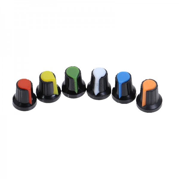 Perilla para potenciómetros de eje estriado de 6mm tipo WH148. Creada para brindarle mayor protección y facilidad de uso a nuestros potenciómetros, aportando estética y comodidad a la hora de rotar el eje de la resistencia variable.