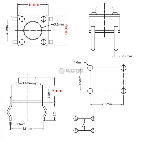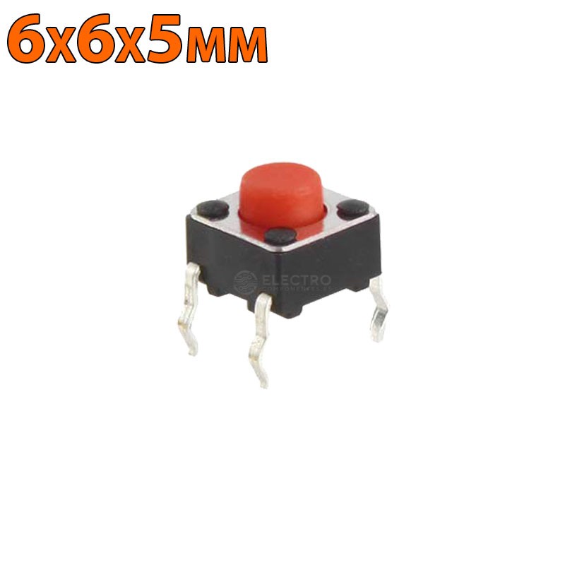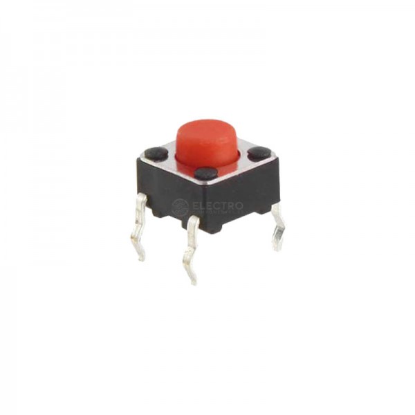 Los mini pulsador (Push Button Switch) son esenciales y unos de los componentes más utilizados en el mundo de la electrónica, su funcionamiento es muy simple y útil para todo tipo de proyectos. Este pulsador con tecla en color rojo , tiene un tamaño de 6mm x 6mm x 5mm y disponen de un contacto de tipo SPST-NO (contacto simple y abierto en reposo), es decir, el pulsador no deja pasar la corriente y cuando lo pulsamos cierra momentáneamente en circuito en el que se encuentre. Son utilizados sobre todo en PCB pero también son compatibles con proyectos en protoboard, la corriente nominal que soportan es de 50mA.