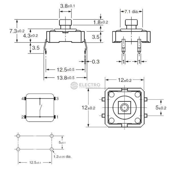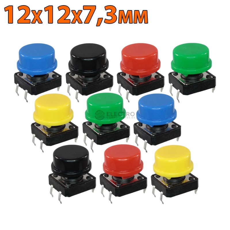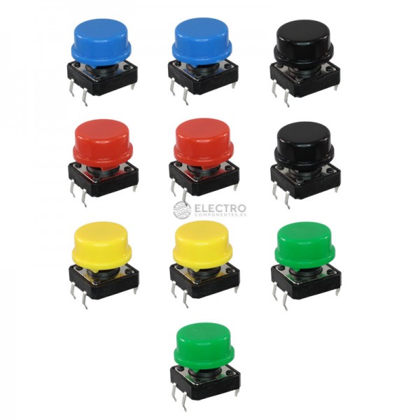 Lote de 10 pulsadores para PCB de tipo B3F con tecla en color rojo, negro, amarillo, verde y azul (2 unidades por color), incluye pulsador de 12x12x7,3mm de 4 pines con contacto simple normalmente abierto SPST-NO y tecla redonda. Los pulsadores (Push Button Switch) son esenciales y unos de los componentes más utilizados en el mundo de la electrónica, su funcionamiento es muy simple y útil para todo tipo de proyectos. Los pulsadores de este lote tienen un tamaño de 12mm x 12mm x 7,3mm con cabeza cuadrada para insertar teclas redondas de color rojo, negro, amarillo, verde y azul. Disponen de un contacto de tipo SPST-NO (contacto simple y abierto en reposo), es decir, el pulsador no deja pasar la corriente y cuando lo pulsamos cierra momentáneamente en circuito en el que se encuentre. Son utilizados sobre todo en PCB pero también son compatibles con proyectos en protoboard, la corriente nominal que soportan es de 50mA.