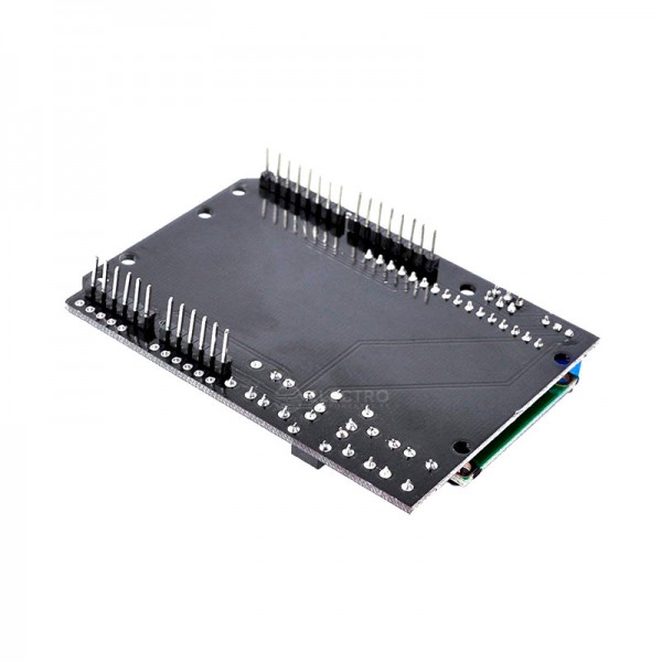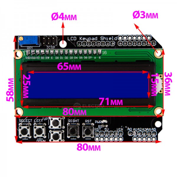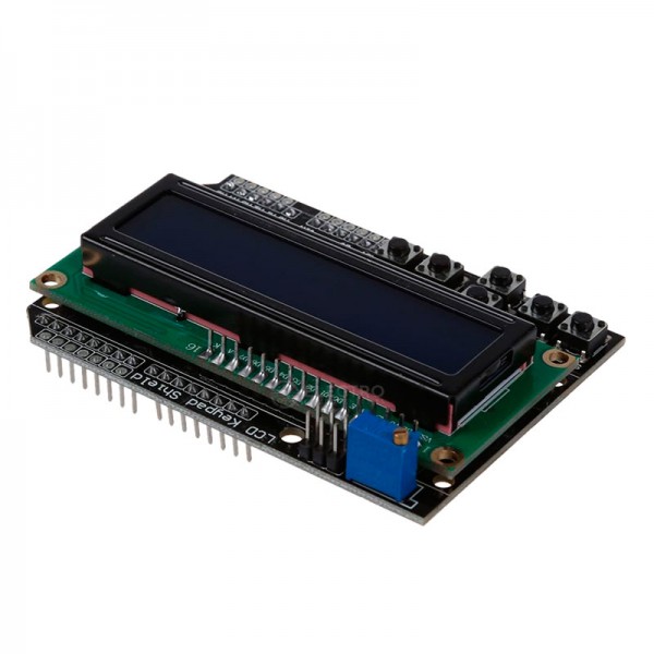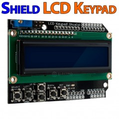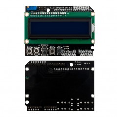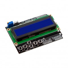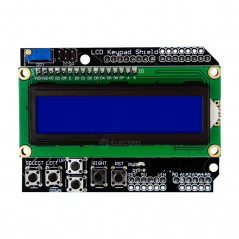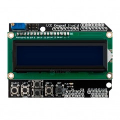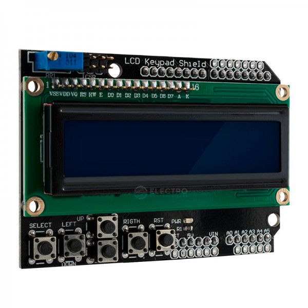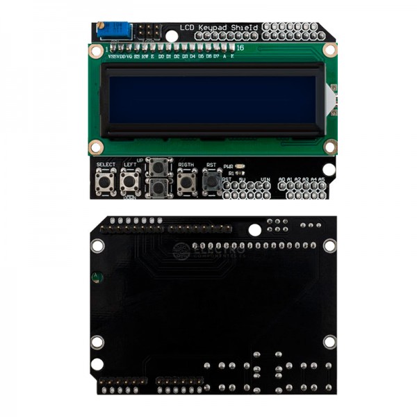 Este Shield con Pantalla LCD1602 permite integrar fácilmente una interfaz de usuario a tus proyectos con Arduino, agregando una pantalla LCD estándar de 16 caracteres x 2 líneas en color azul y botones para la navegación a través de un sistema de menús. El display es compatible con el controlador HD44780 y está conectado en modo de 4 bits (pines digitales 8, 9, 4, 5, 6, 7), por lo que se puede usar directamente mediante la biblioteca de Arduino LiquidCrystal. El teclado dispone de 6 botones distribuidos de la siguiente manera: seleccionar, arriba, abajo, derecha, izquierda y reset. Los botones en el shield se encuentran multiplexados, de manera que todos pueden leerse mediante un único pin analógico.