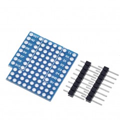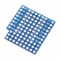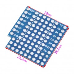 Protoboard de doble cara para Wemos D1 mini ESP8266. Ideal para implementar rápidamente pequeños circuitos con el Wemos D1 mini. Se puede acceder a los pines del ESP8266 desde las pistas a cada lado de la placa. Hay 32 agujeros disponibles en el centro de la placa y 27 agujeros en el extremo.