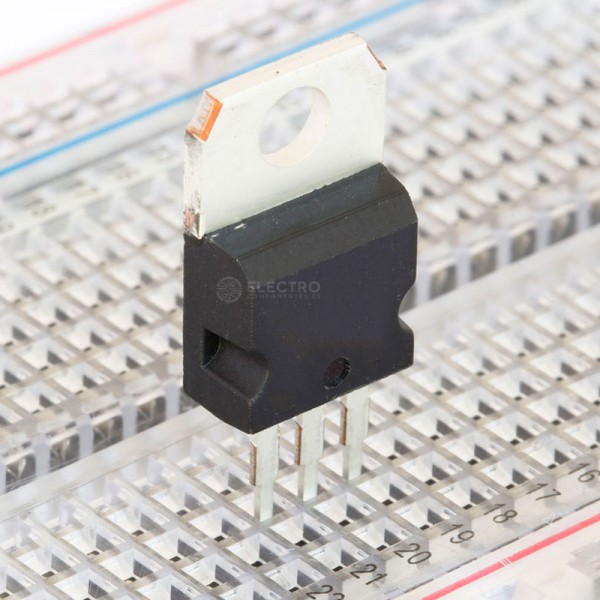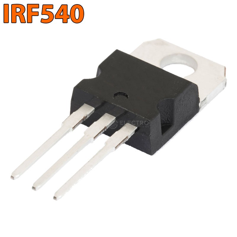 Transistor de potencia MOSFET IRF540NPBF de canal N, capaz de manejar intensidades de 33A y voltajes de 100V. Es un MOSFET de potencia que nos permitirá manejar cargas elevadas al mismo tiempo que nos permite una conmutación rápida, diseño de dispositivo robusto y baja resistencia.